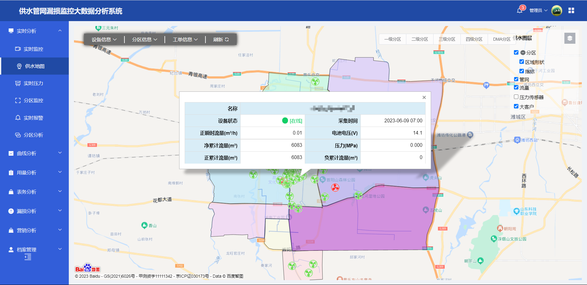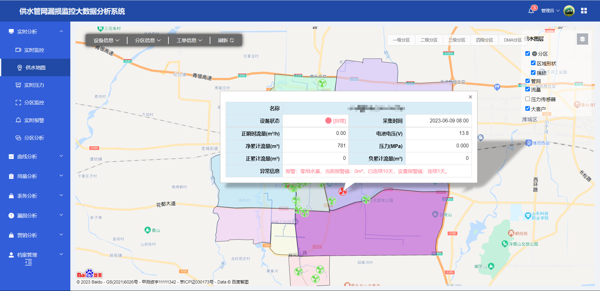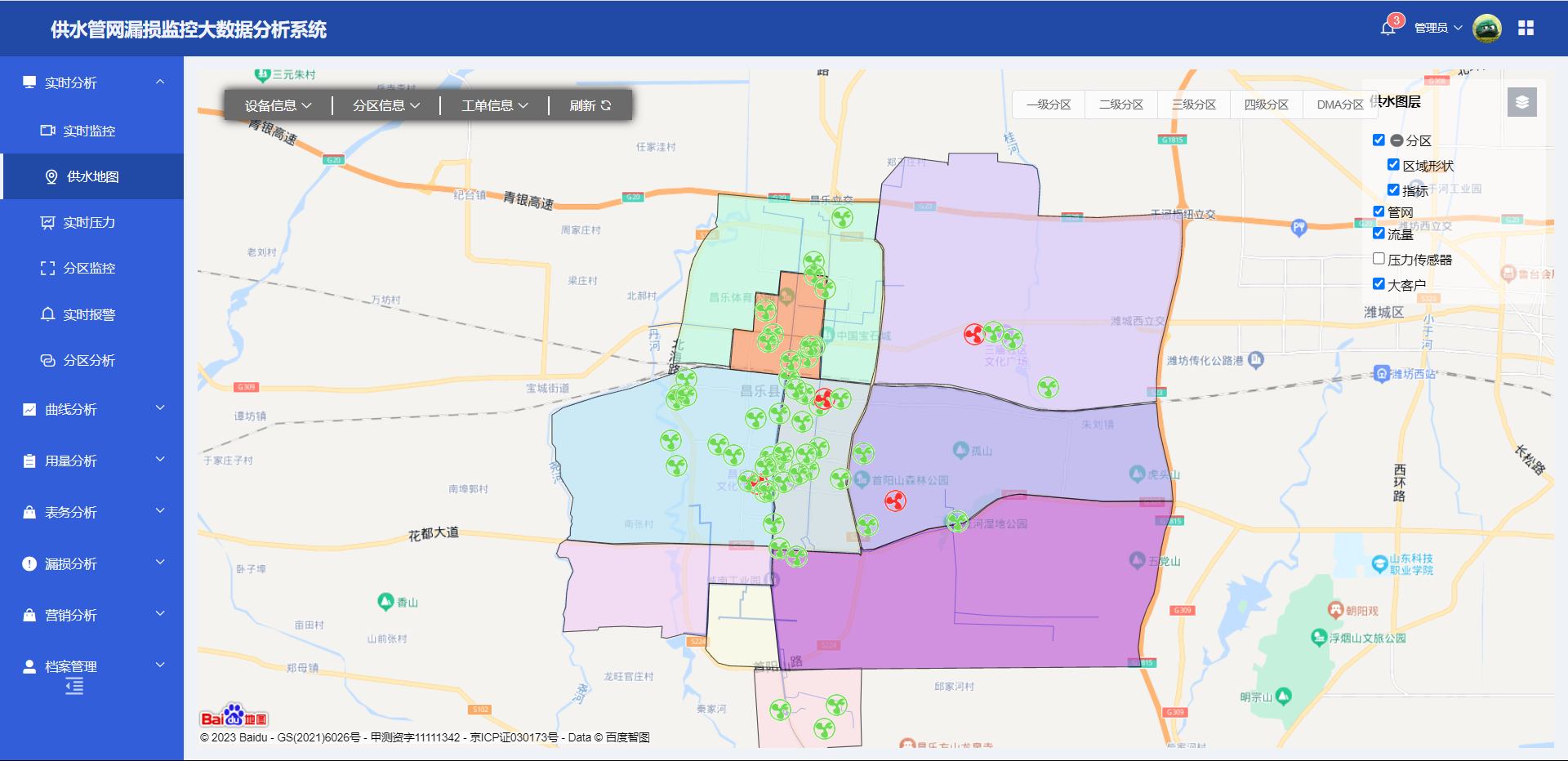 ● 實時(shí)監測:系統采用(yòng)先進的(de)傳感器(qì)技(jì)術(shù),可(kě)以實時(shí)監測每個(gè)分(fēn)區(qū)的(de)水(shuǐ)量、壓力等參數(shù),∑及時(shí)發現(xiàn)異常情況并進行(xíng)處理(lǐ)。